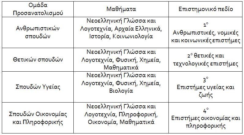 • Τα εξεταζόμενα μαθήματα ανά ομάδα προσανατολισμού και τα επιστημονικά πεδία είναι: